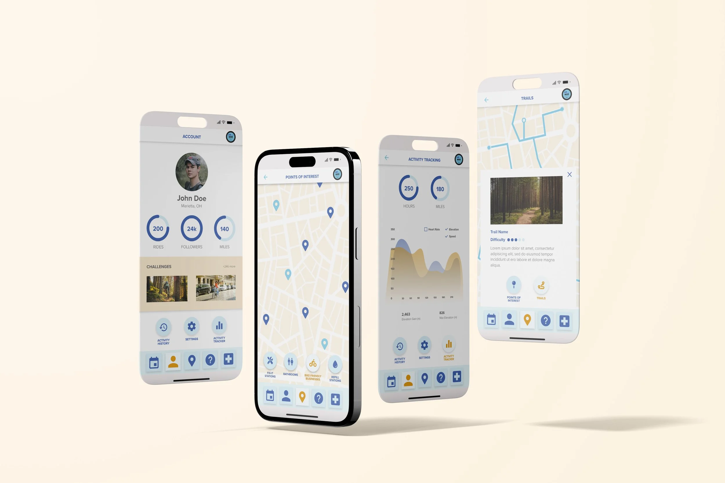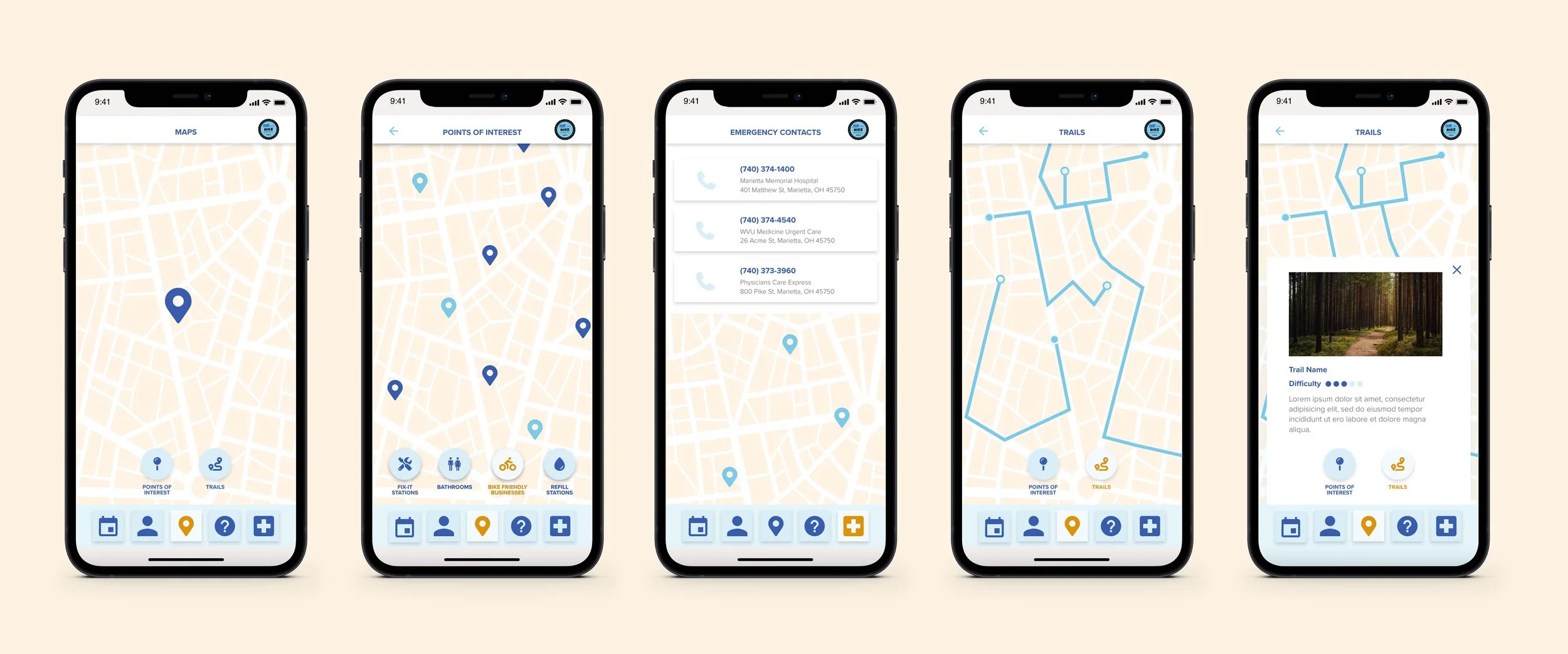 Bike Marietta, a local biking club, came to our class with an idea for a fantastic app design project. Working in Adobe XD, I wanted to create an app that would allow bike enthusiasts from all over access to trails and promote upcoming events. We included a bio and stats area so users could keep track of their miles, speed, and hours traveled and an events panel that allows people to quickly and easily sign up for rides. Finally, we incorporated an interactive map where riders can find bathrooms, water-filling stations, and bike-friendly businesses along their routes. Quick-dial emergency numbers were included as a safety feature for those unfamiliar with the area. Click on the singular iPhone picture to view an interactive prototype of my app!