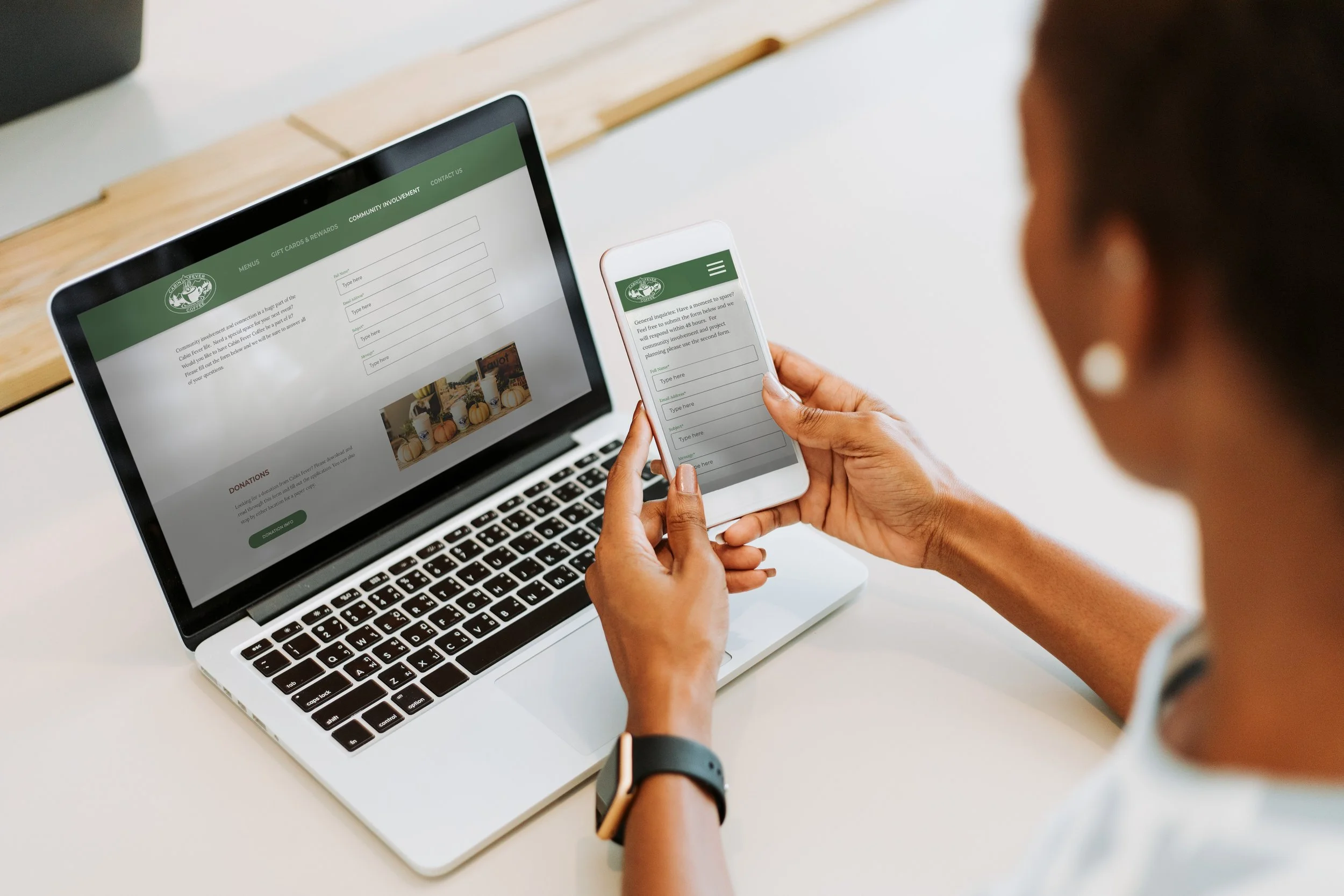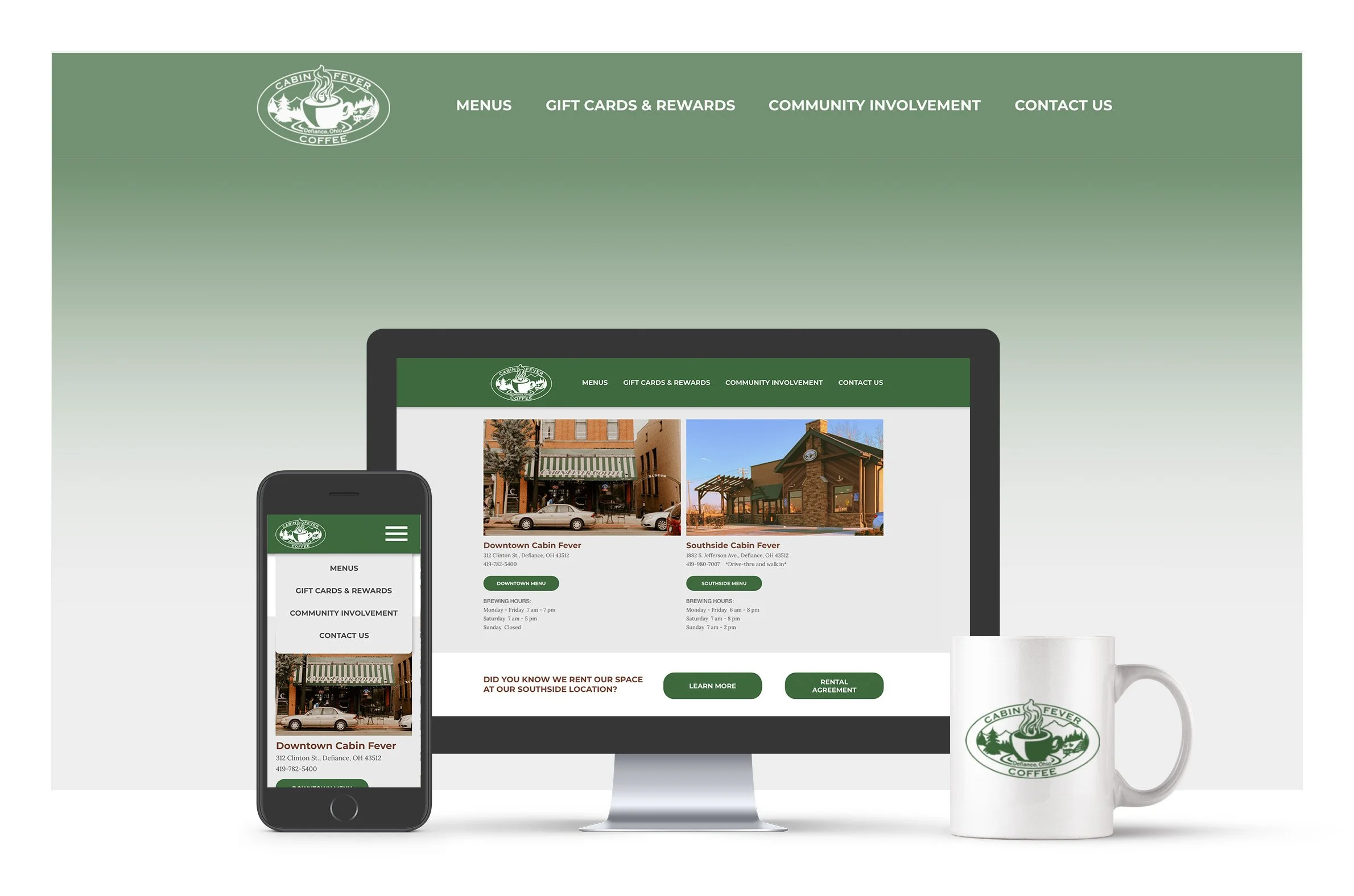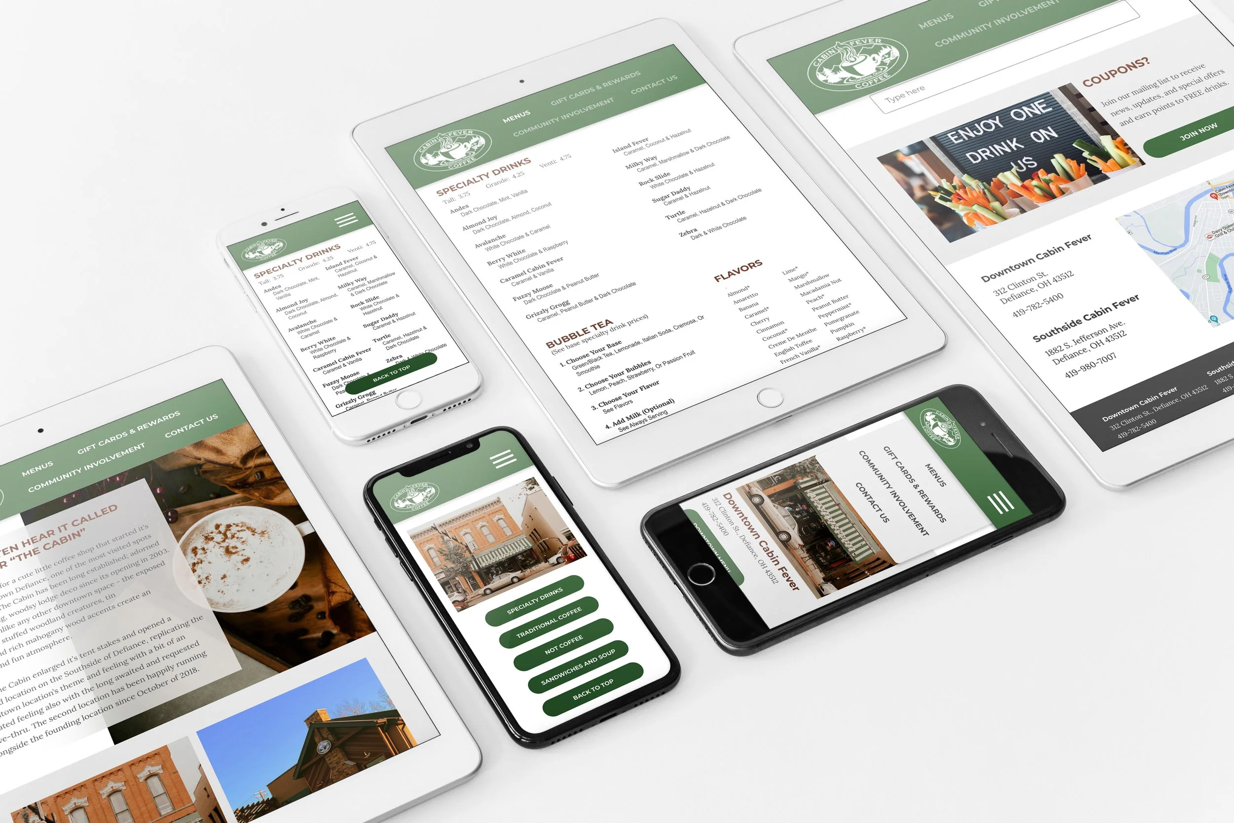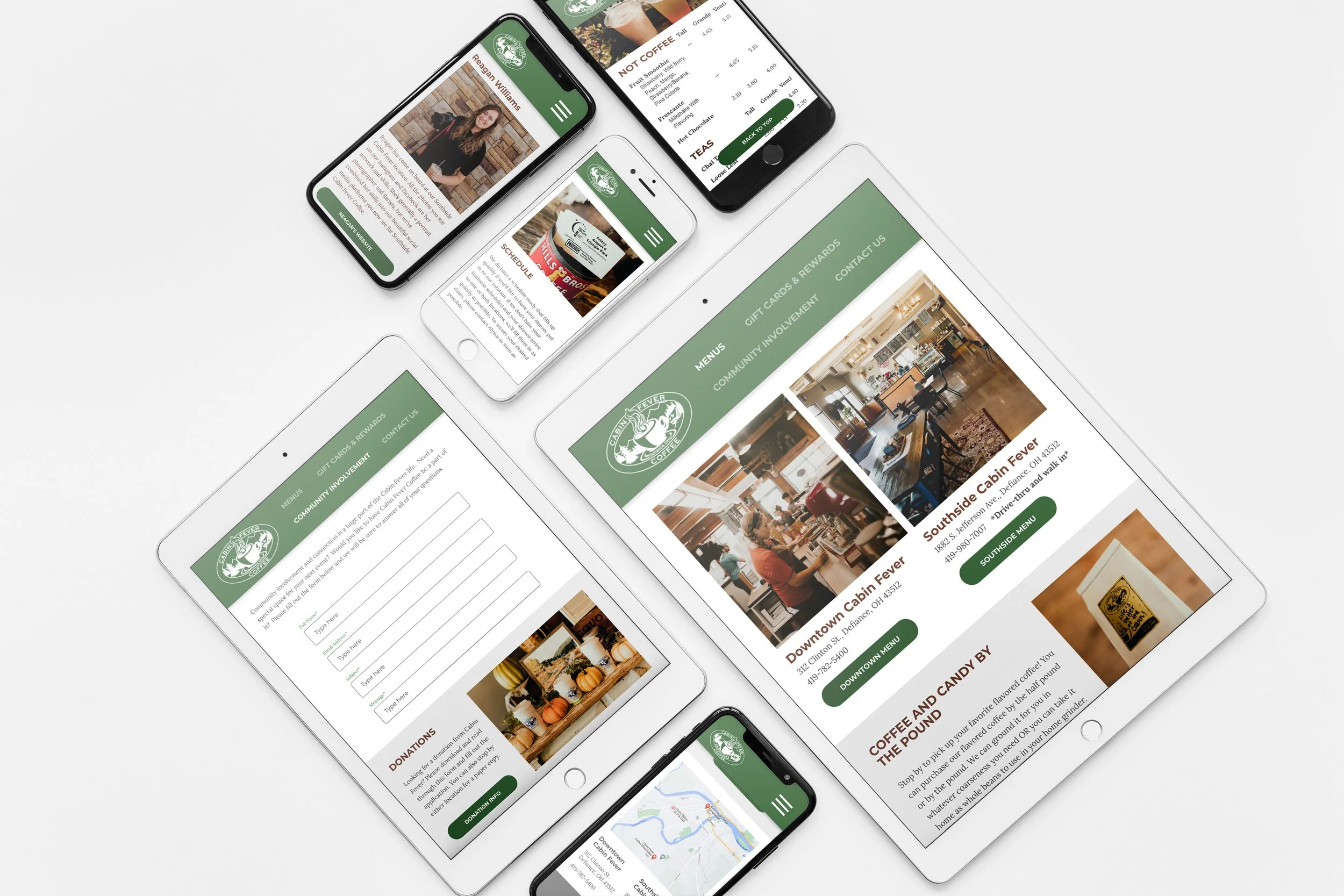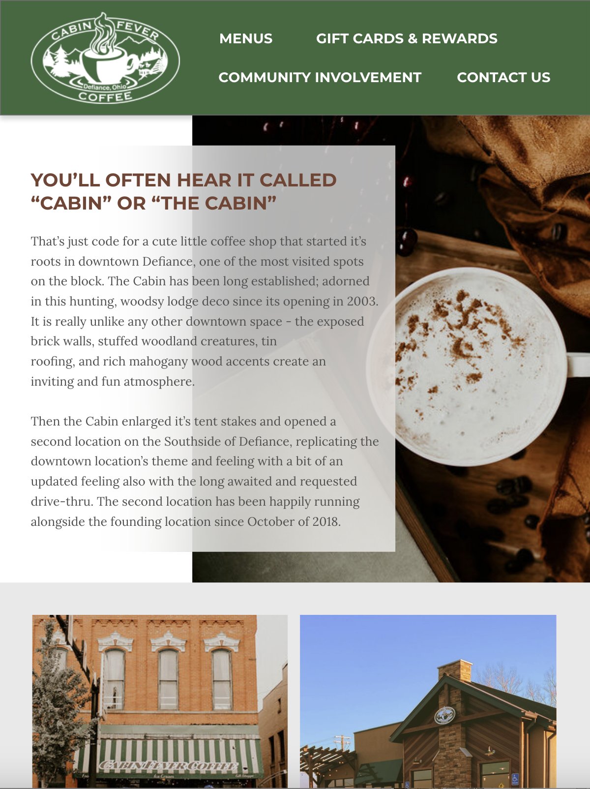 Cabin Fever Coffee is a small coffee shop in Defiance, Ohio. Their current website was good overall, but I wanted to restructure a user's path through the website. The written content was long and repetitive, so I shortened the copy for clarity and to shorten the length of each page. Most of the pages in the mobile version were scaled too big, and the picture of their menu was hard to read. I opted to type out their menus to make them searchable and responsive to the browser size. I organized the navigation based on user feedback and included buttons for smoother returns to the tops of pages. Click on the desktop and tablet pictures for an interactive prototype of my website!