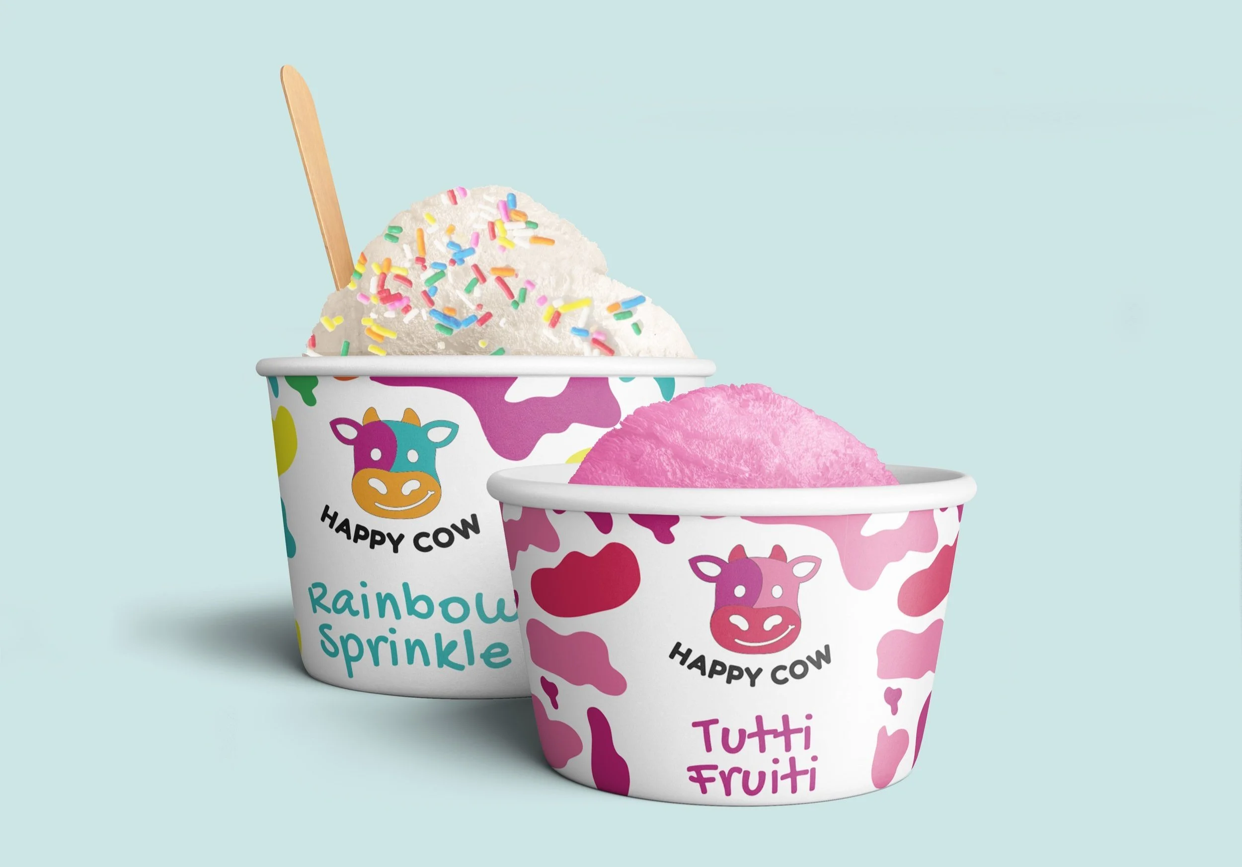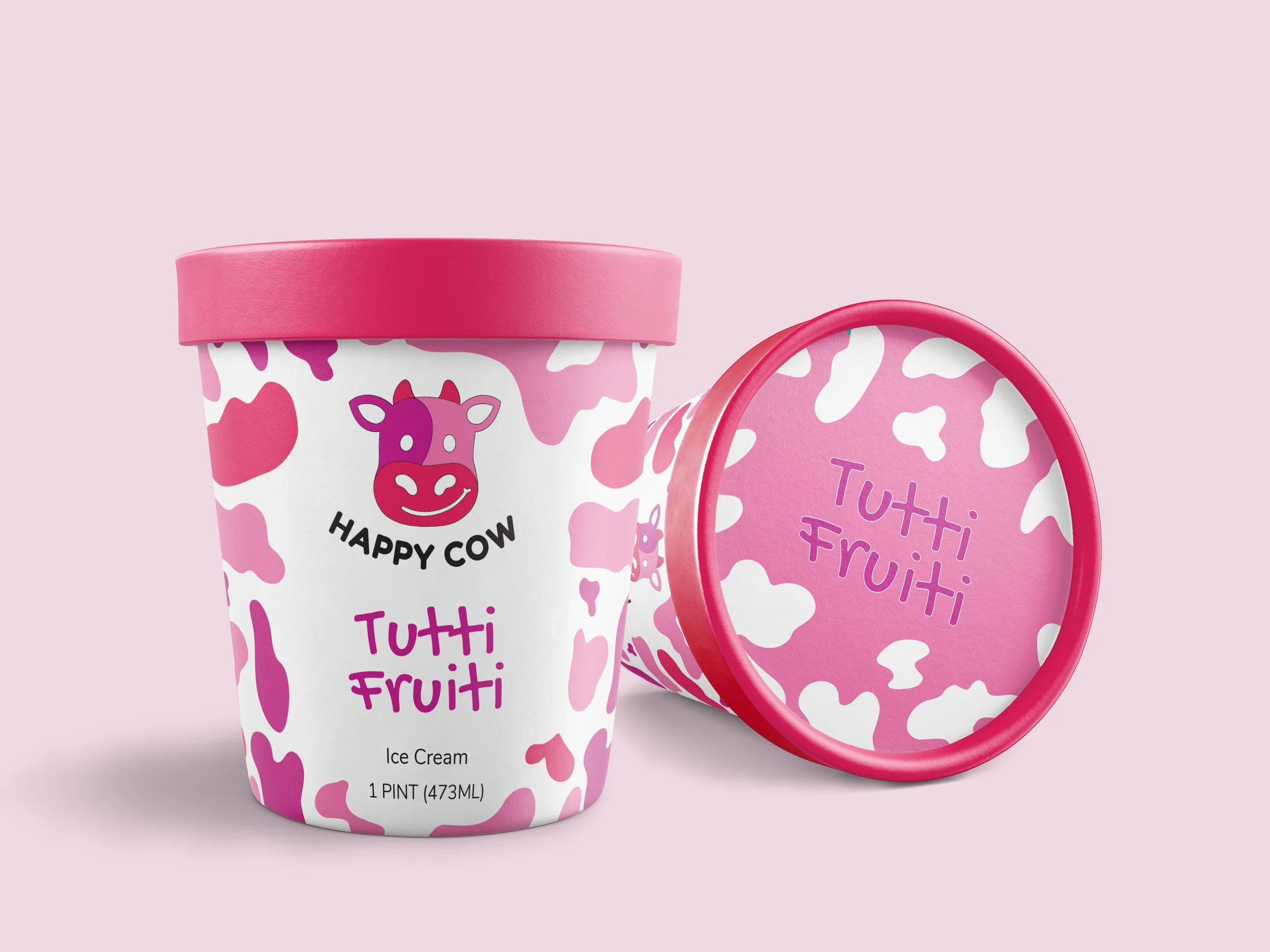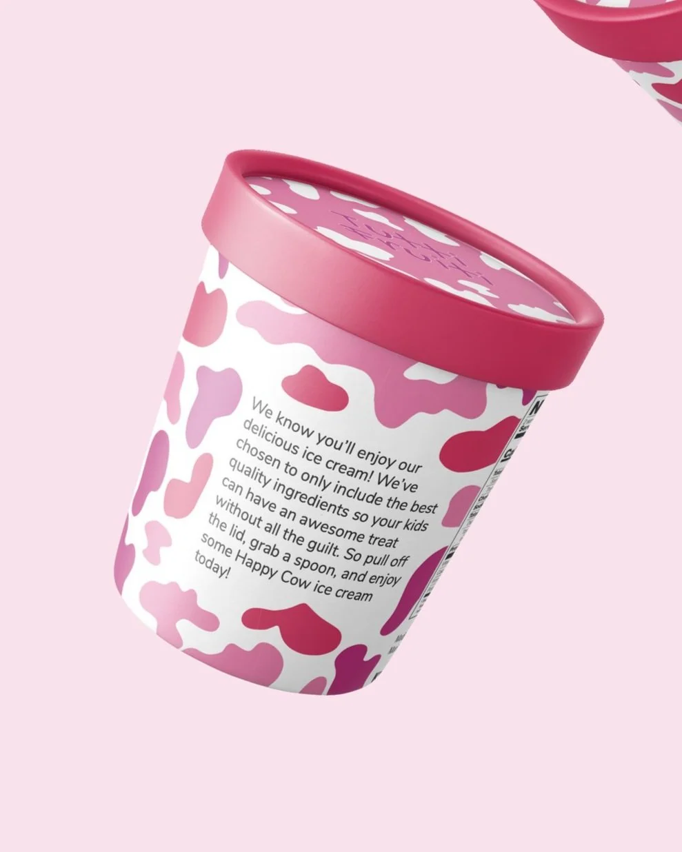 Happy Cow Ice Cream is a pint-sized ice cream brand for pint-sized people. I created a cute cow character to draw children in and introduce a likable "mascot" for the brand. The color palettes for each flavor were based on the colors of the ice cream ingredients, but I increased the saturation to appeal to a younger audience. (Tutti Fruiti is strawberry flavor, S'mores is graham cracker, marshmallow, and chocolate, and Rainbow Sprinkle is birthday cake flavored) This project was an opportunity for me to learn how to illustrate repeating backgrounds like the cow spots used on each container.